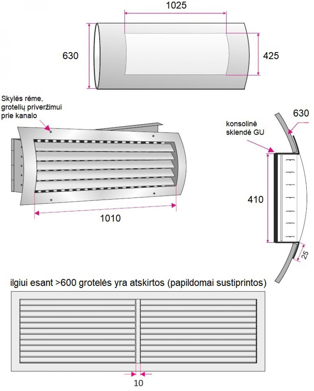 STS-S/W/GU/1025x425/630 Spiral duct diameter Ø630 mm, installation hole on duct dimensions 1025x425 mm, air flow opening dimensions 1010x410 mm, effective area 0.303 m²