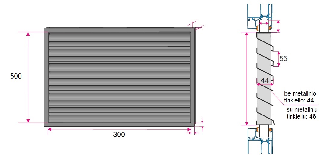 Ventilation grille, external, for installation in a door or window profile, for air intake and exhaust from the room, rectangular form, special shape horizontally placed fixed grille blades protects from precipitation, manufactured from powder coated galvanized steel, RAL9006 color, central mounting in a panel, grille light surface dimensions 300x500 mm, effective area 0.08 m²