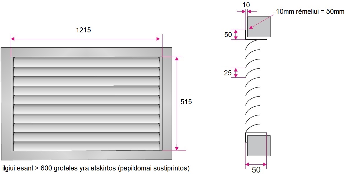 Standard grille is made of powder coated galvanized sheet steel. On the special request it can be made of stainless steel or aluminum and painted in any RAL color. On request, grille may have behind blades extra mesh to protect against from getting to the installation of larger impurities (solution used for assembling grille as external intake louvres).