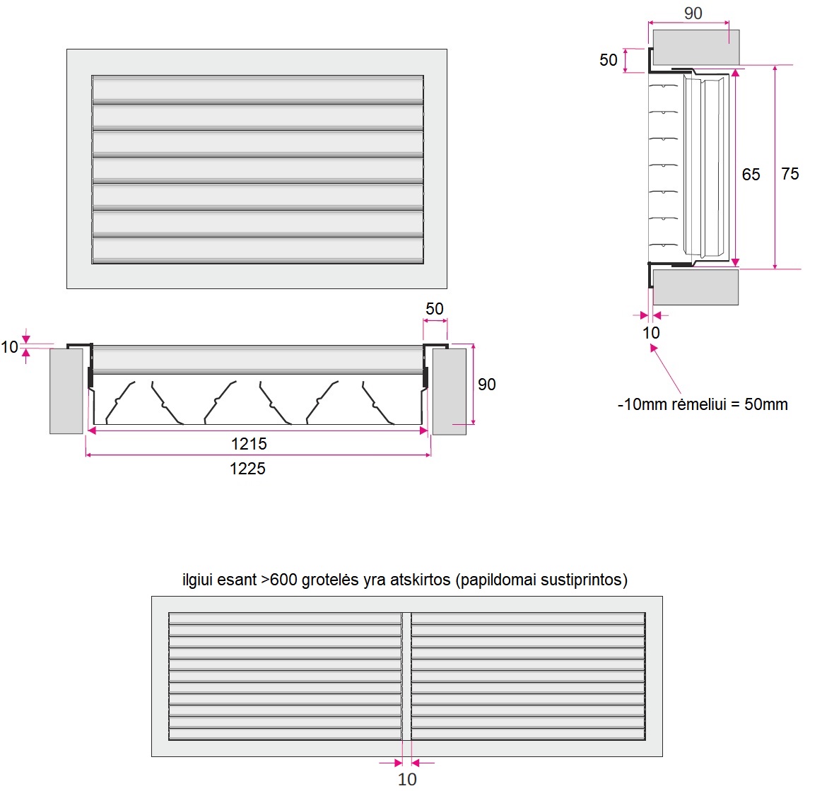 External dimensions 665x115 mm, opening dimensions 615x65 mm, installation hole dimensions 625x75 mm