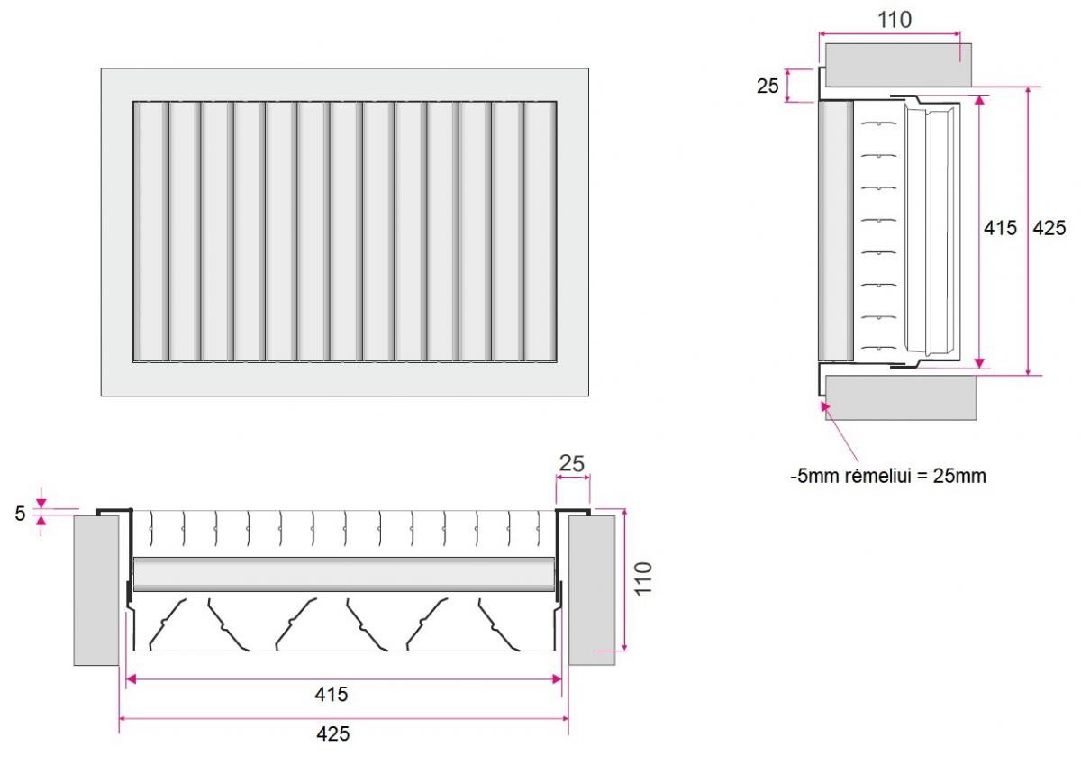External dimensions 465x115 mm, opening dimensions 415x65 mm, installation hole dimensions 425x75 mm