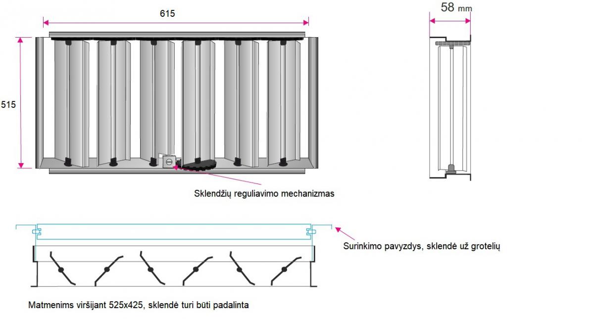 Damper with counter running blades GP is used to regulate the air flow in ventilation wall grilles, ceiling and floor, and in anemostat diffusers installed in medium and low pressure ventilation instalation. GP has a counter-slat system with control from the front of grille using a flat screwdriver.
