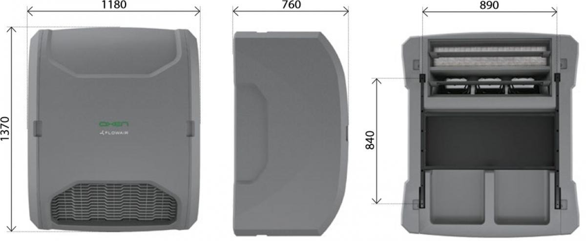 OXeN-X2-W-1.2-V With additional 10 kW (water 80/60°C, air 5°C) water heat exchanger, air flow 150-1200 m³/val., air stream range 15 m, heat recovery efficiency 74.7-80.9%, acoustic pressure level 49 dB(A), maks. power consumption 420 W, protection class IP42, weight 77.5 kg, 2 year WARRANTY